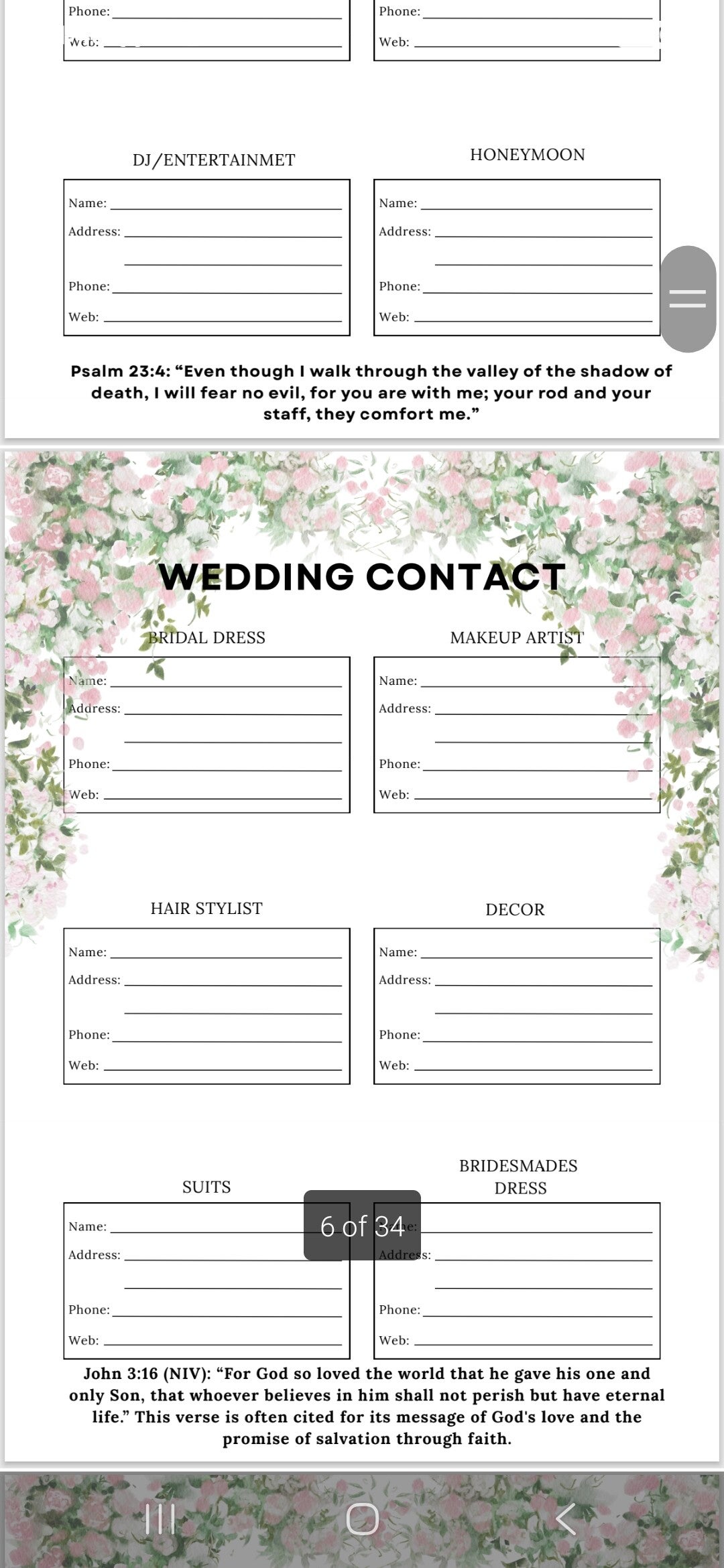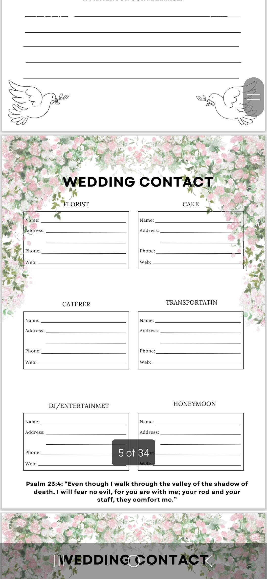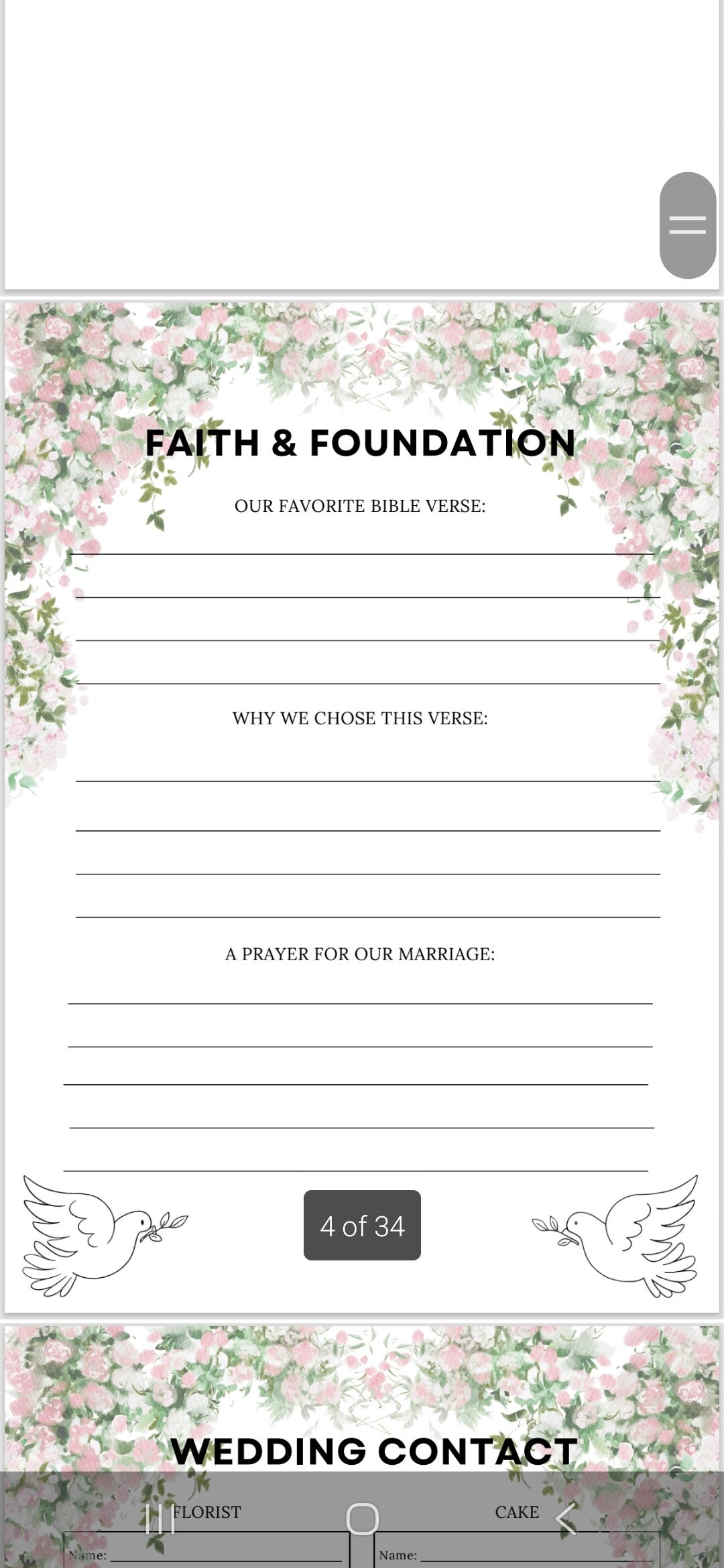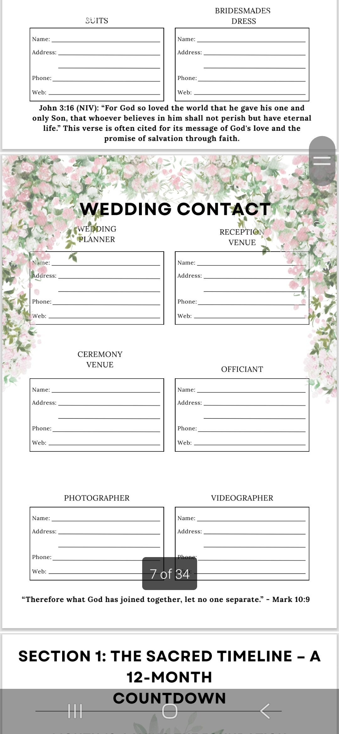 The pdf allows you to download and add as many of each page you need. For small weddings or big you can keep on top of it all. With faith and god at the head.